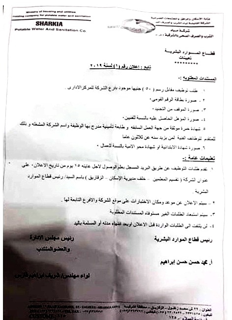 اعلان وظائف رقم 1 لسنة 2019 شركة مياة الشرب والصرف الصحى بالشرقية