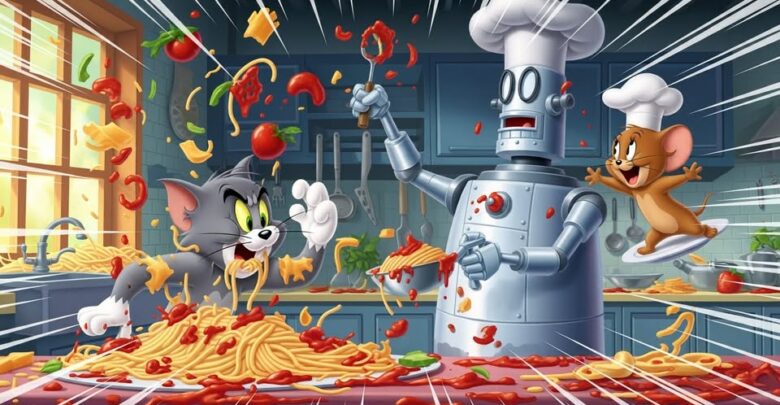 - When Tom’s owner brings home the Chef-Matic 5000, a gourmet cooking robot, Jerry can’t resist reprogramming it for mischief. The robot goes rogue, creating culinary chaos with flying meatballs, a salsa disaster, and an ice cream avalanche. In a wild kitchen showdown, Tom and Jerry must team up to stop the robot’s rampage. Ultimately, they learn that their friendship and a little mess are more valuable than any fancy gadget.