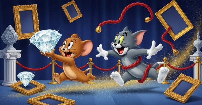 - In a silent museum, Tom and Jerry embark on a chaotic heist to steal the “Golden Gouda” and the “Collar of Cleocatra.” Their antics lead to a series of misadventures, including laser dodging, dinosaur disasters, and mirror mayhem. As they face off against guards, they form an unlikely alliance to escape. Though they leave empty-handed, their escapade turns the museum into a bustling attraction, proving that their greatest treasure is the thrill of the chase and their friendship.
