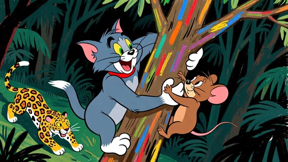 • Tom and Jerry’s rivalry takes an unexpected turn when they find themselves sealed in a box and shipped to the Amazon rainforest. After a series of wild escapades involving a snake, a jaguar, and piranhas, they form an unlikely alliance to survive. Their journey leads them to a giant mango, resulting in a chaotic launch back home. Changed by their adventure, they return to their cozy house with a newfound respect for each other, ready for a nap.