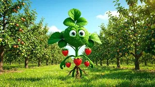 The strawberry plant dances and sings; it has eyes and a mouth, and it jumps around while dancing in the fruit orchard.